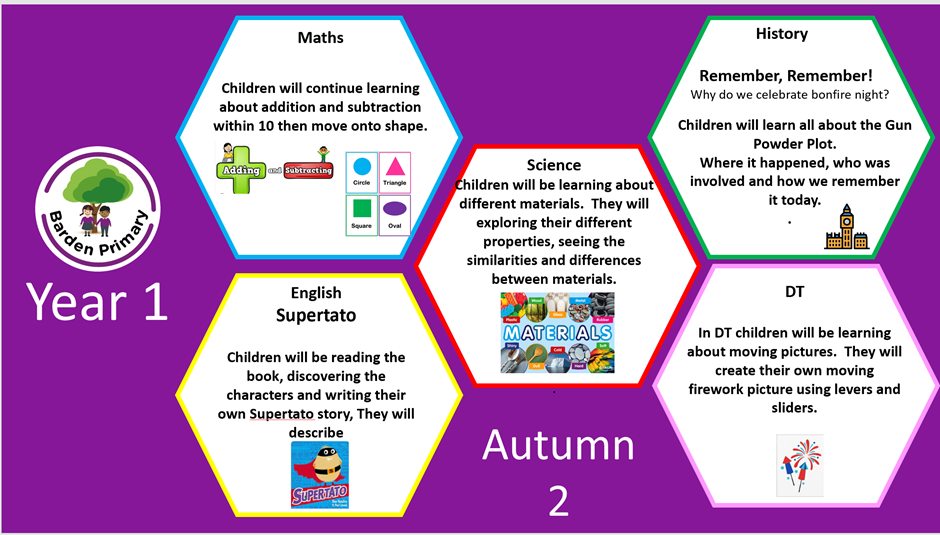 Welcome back to another half term at Barden! We hope you have had a wonderful week and we are excited fro an exciting term as we build up to Christmas! This half-term, our topic is 'Remember, Remember'. Our focus topics are History and DT. In History, we will be learning about the reason why we celebrate bonfire night every year, looking at the Gunpowder Plot and Guy Fawkes. In DT, we will be exploring moving mechanisms, finding different ways of getting the children's creations to move, leading them to making their own moving mechanism.