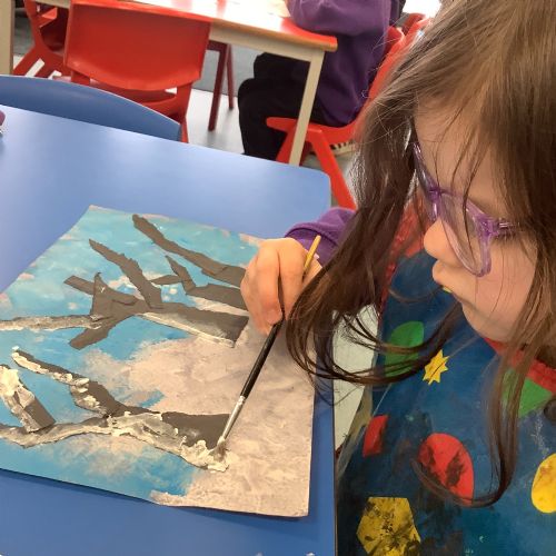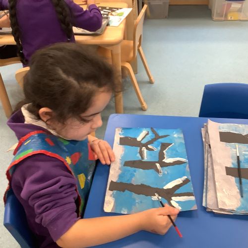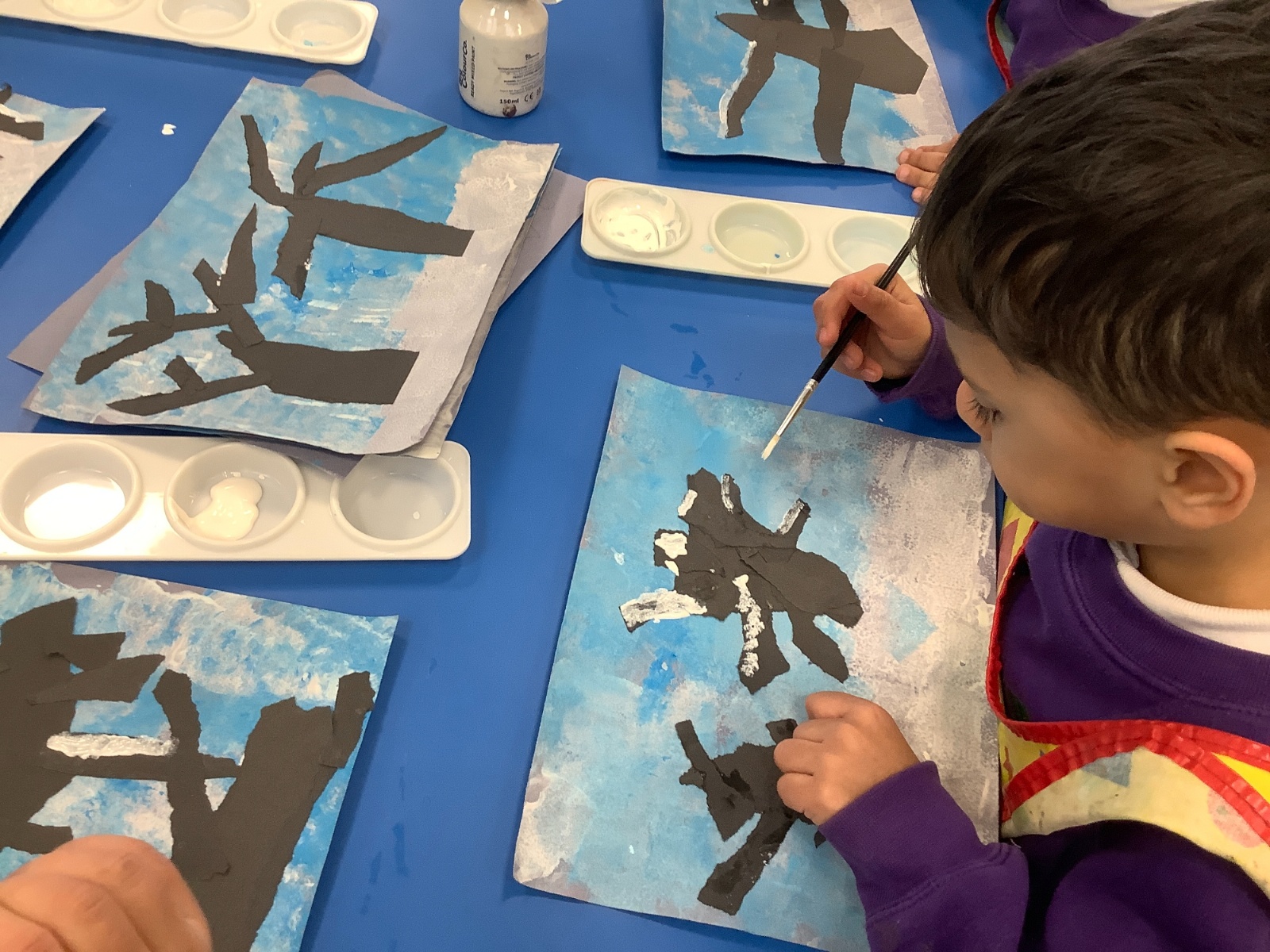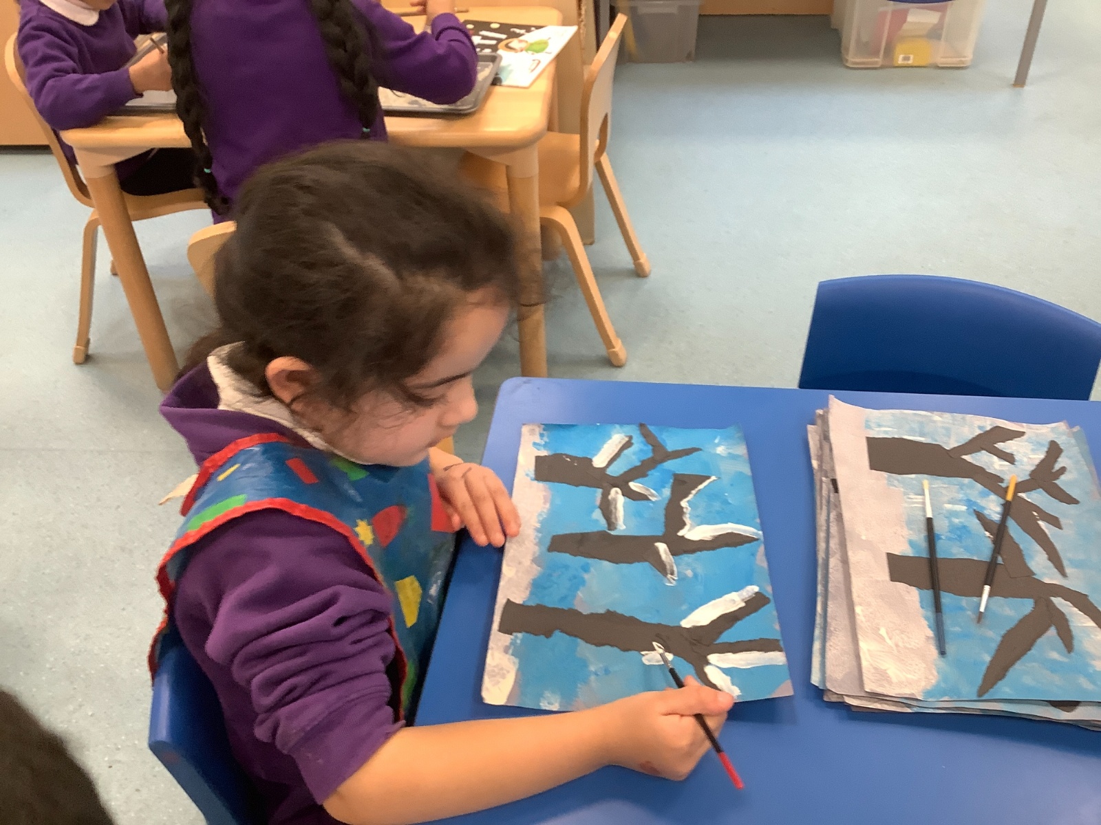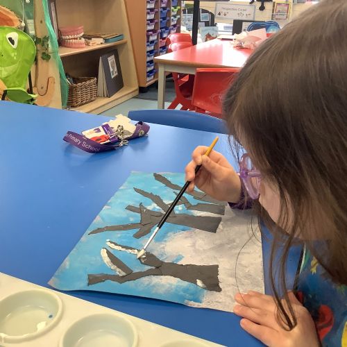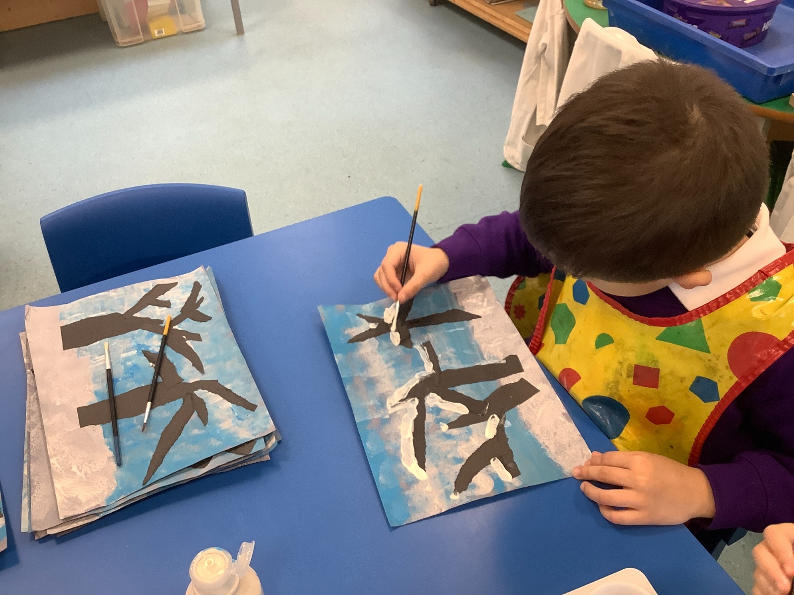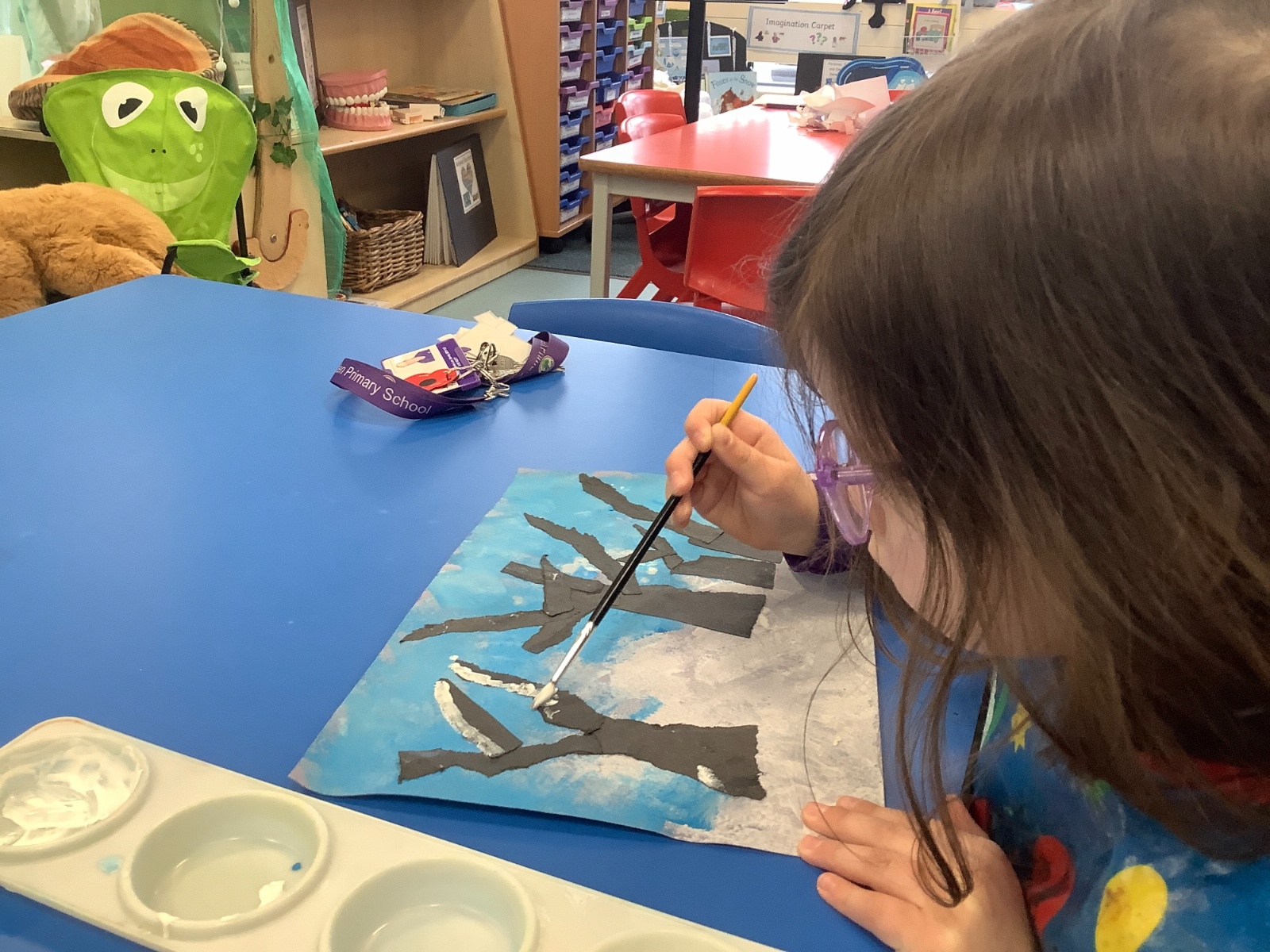 Winter Paintings - We used a thin paintbrush to paint snow on the trees.