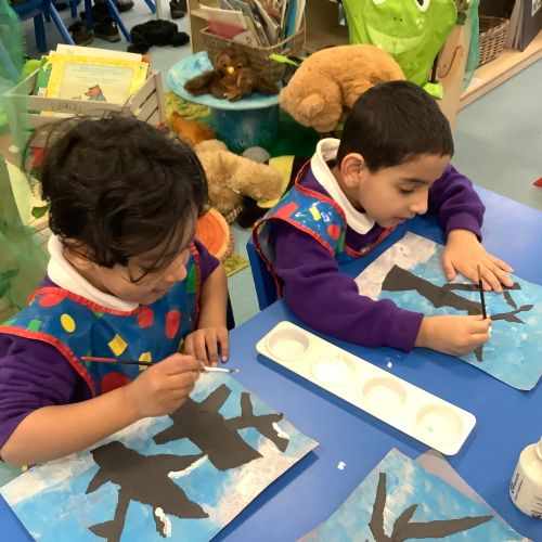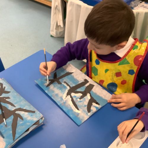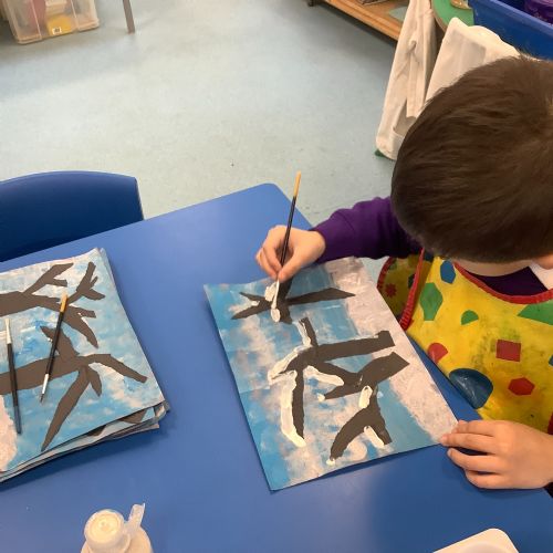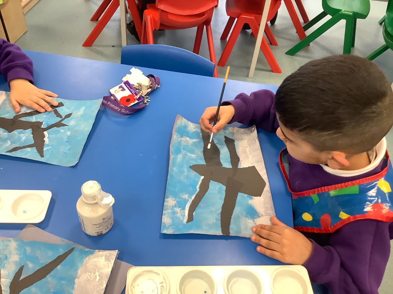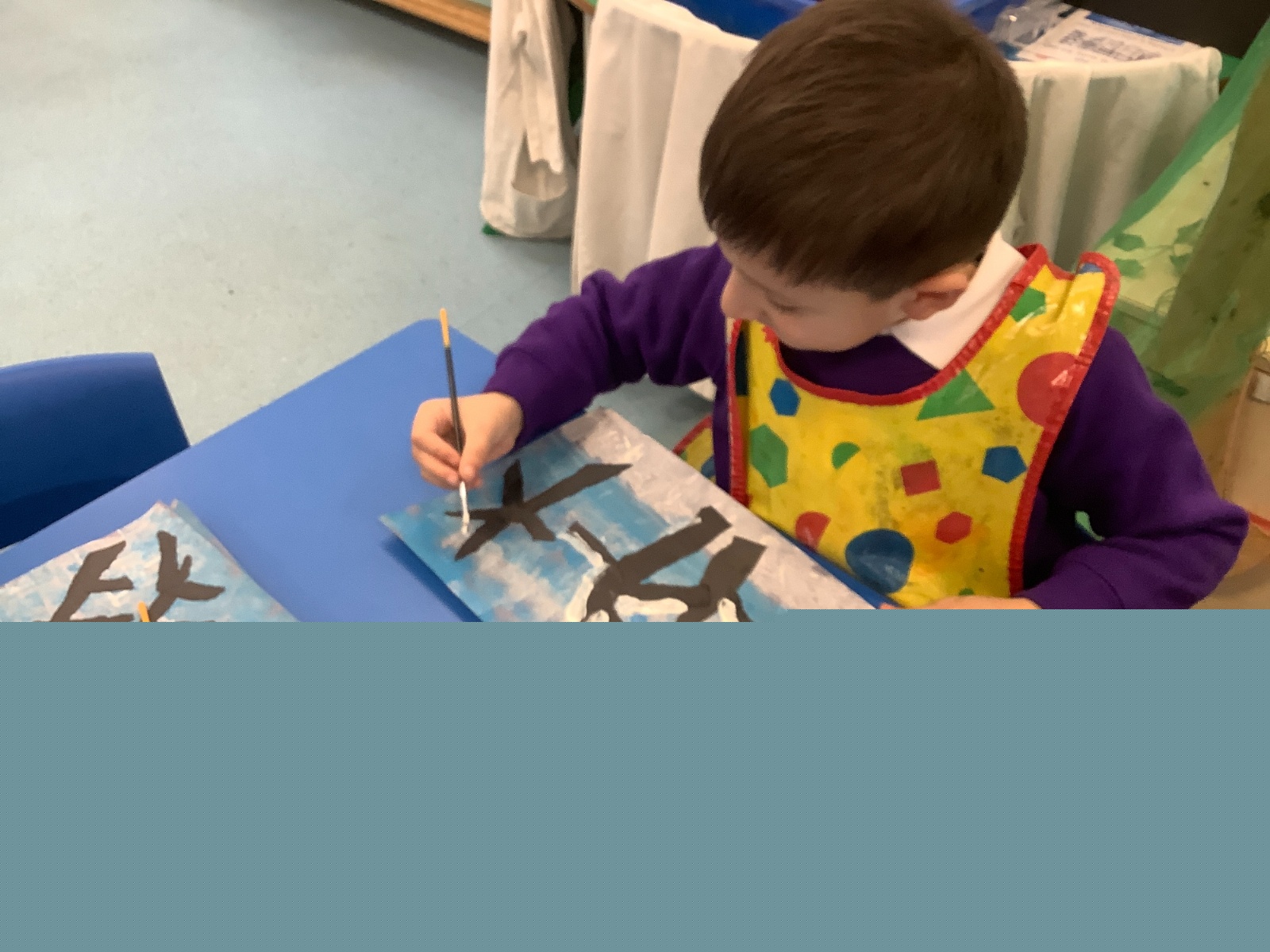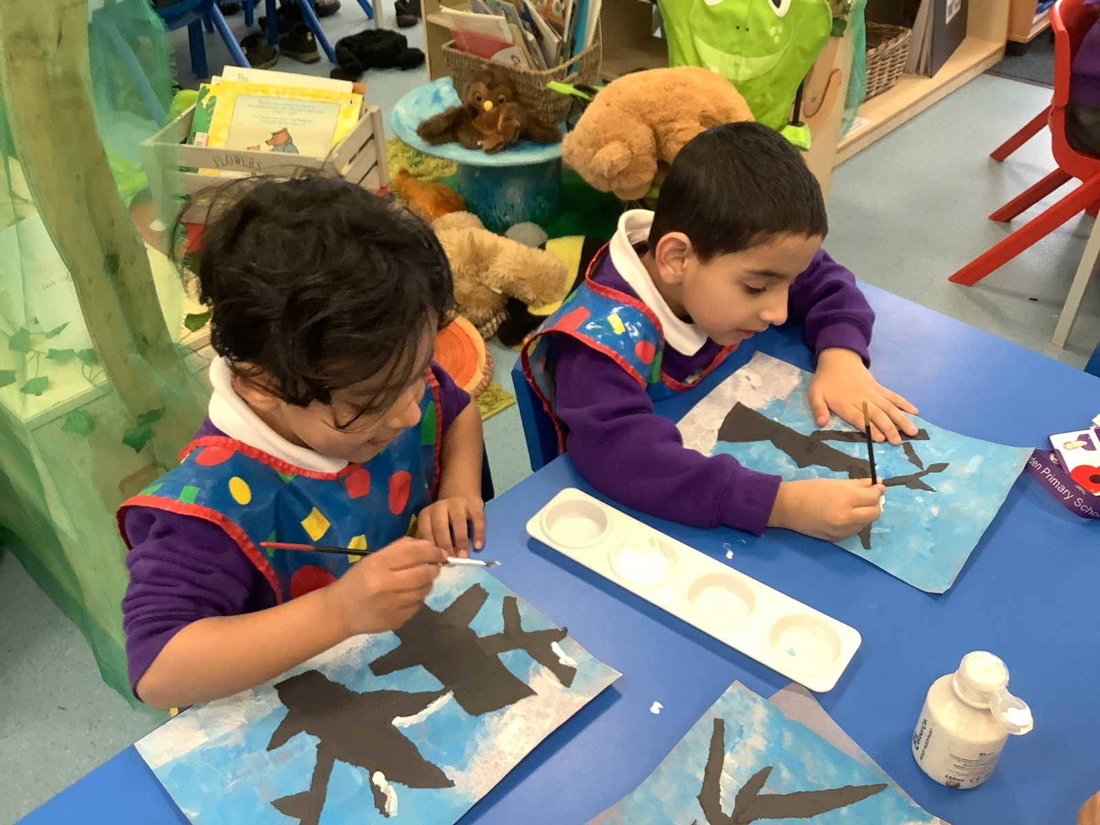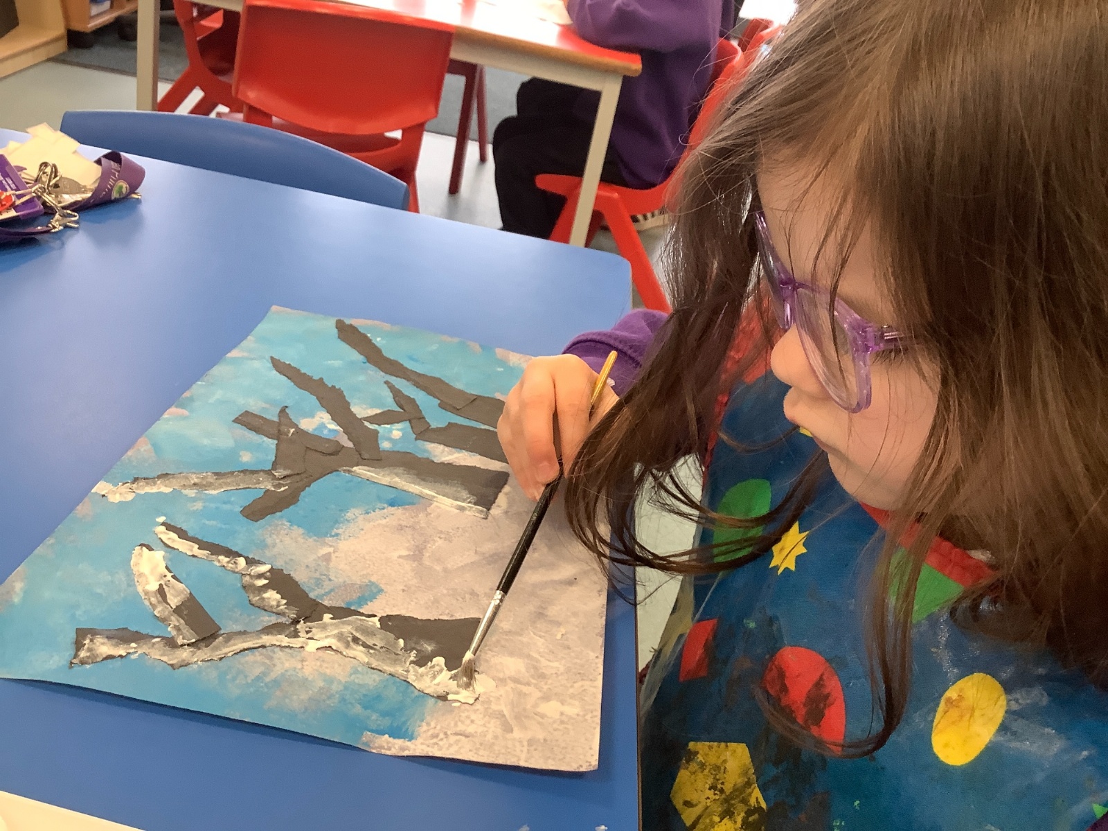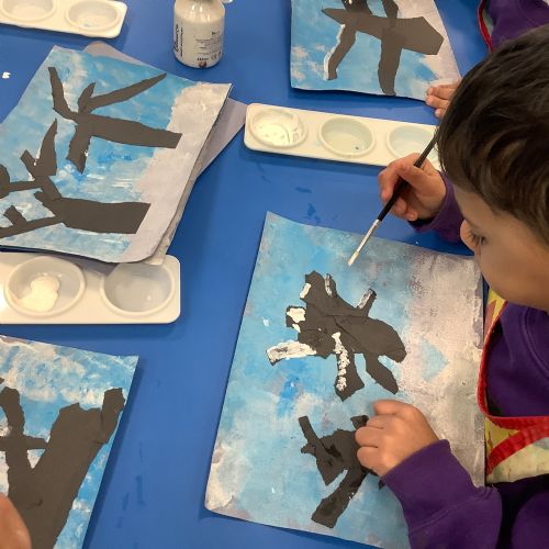 Winter Paintings - We used a thin paintbrush to paint snow on the trees.